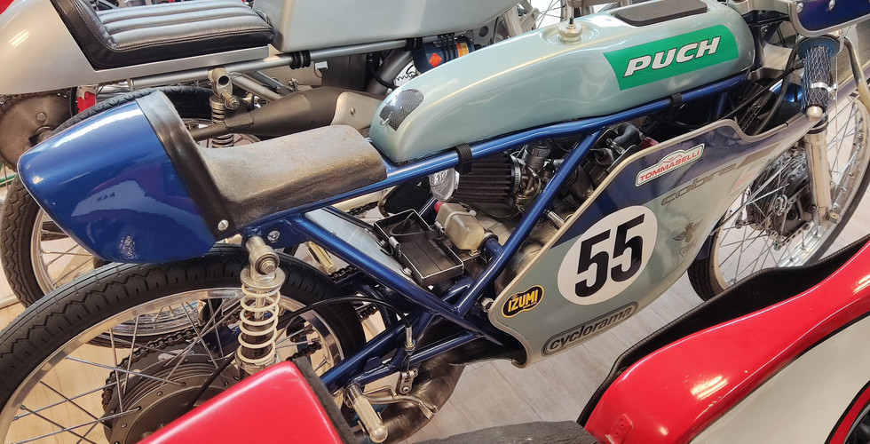 Het was even zoeken naar de juiste richting maar Google Maps bracht uitkomst. Eenmaal bij het museum werden we hartelijk ontvangen door Ria die de koffie en stroopwafels allang klaar had staan. Zoals verwacht werden we hier ondergedompeld in een schat aan motorgeschiedenis. Zie het artikeltje over dit museum in de Kurier nr 148 van juni. De verzameling van Teus Burggraaff, zijn levenswerk, betoverde ons met zeldzame en speciale motorfietsen, waaronder een opvallende CZ-motorfiets uit 1939, gezegend door het Vaticaan.